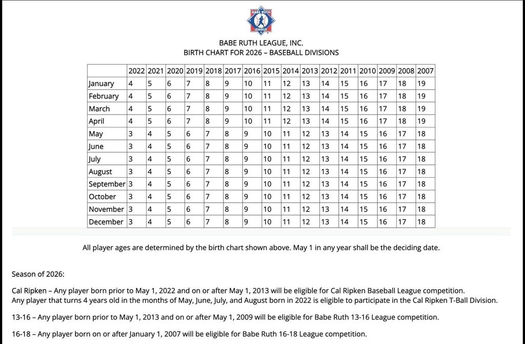 FOR BASEBALL: Your player's age for the 2026 season is determined by their age as of April 30, 2026. Official age chart can be found at the bottom of this page!